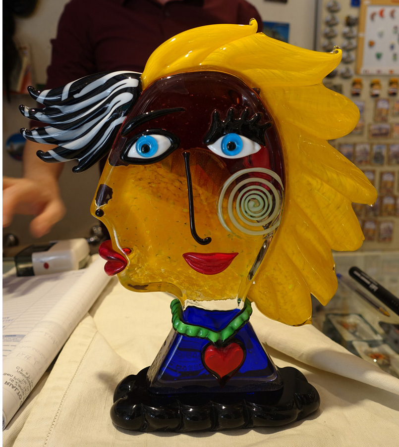 After examining the contents of the entire shop, which has two floors, and vacillating between two crazy pieces, Sylvia buys a Picasso-inspired head with a face in profile and another head-on. The shop will mail it to her.